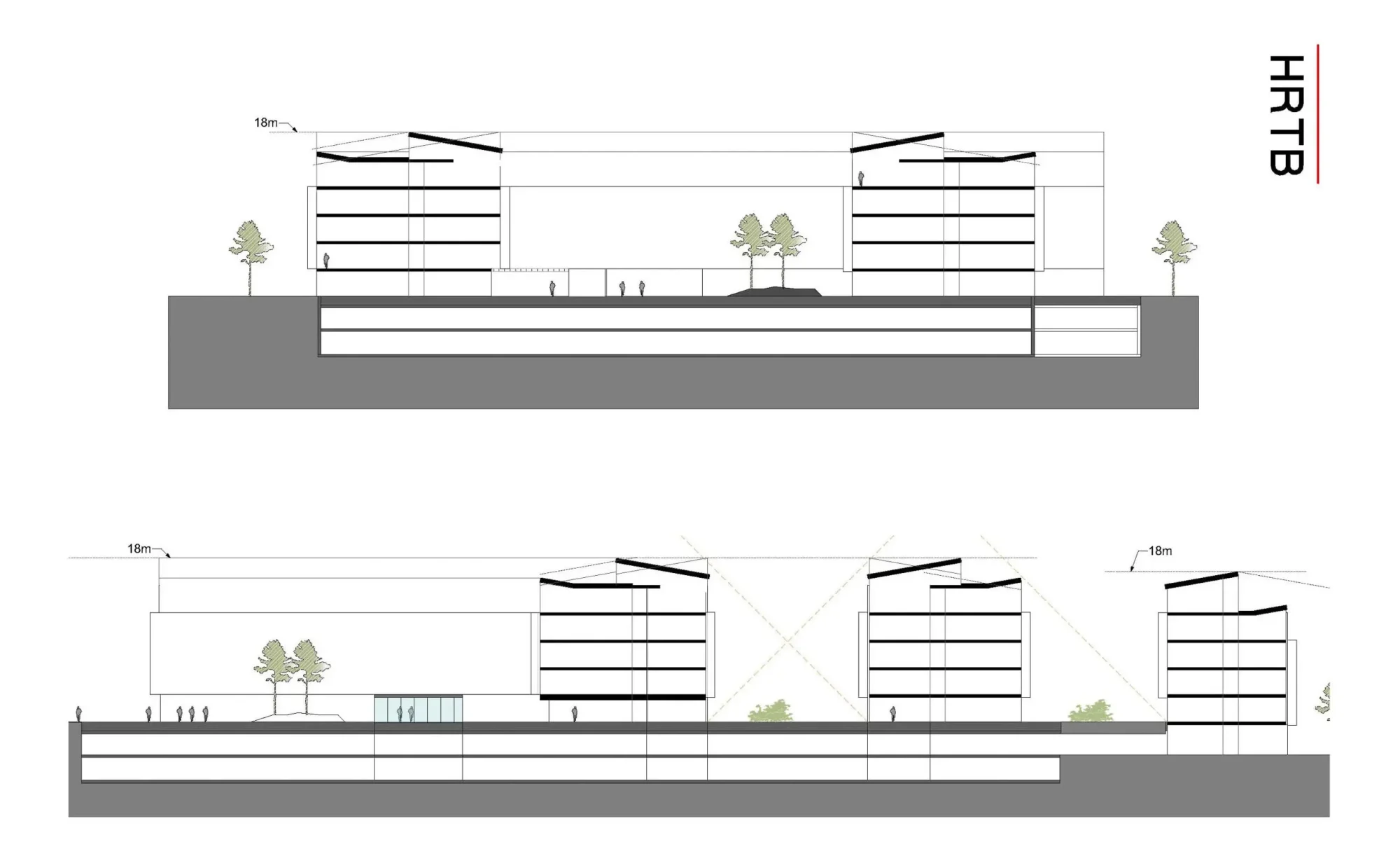 Etasjeskillene er artikulert med gjennomgående horisontale belter, mens det mellom disse er stående panel med vindusfelter i samme høyde. På denne måten gis variasjon i fasadeuttrykket. Balkongene er stedvis inntrukne og stedvis utenpåhengte og har vertikale sortmalte stålspiler. Underside av balkonger har farge som bygget ellers. Over uteserveringen på terreng er det tenkt en massiv baldakin i samme materiale som bygget ellers. Her vil det komme en himling i lysere treverk, som gir en fin varme til området under tak.