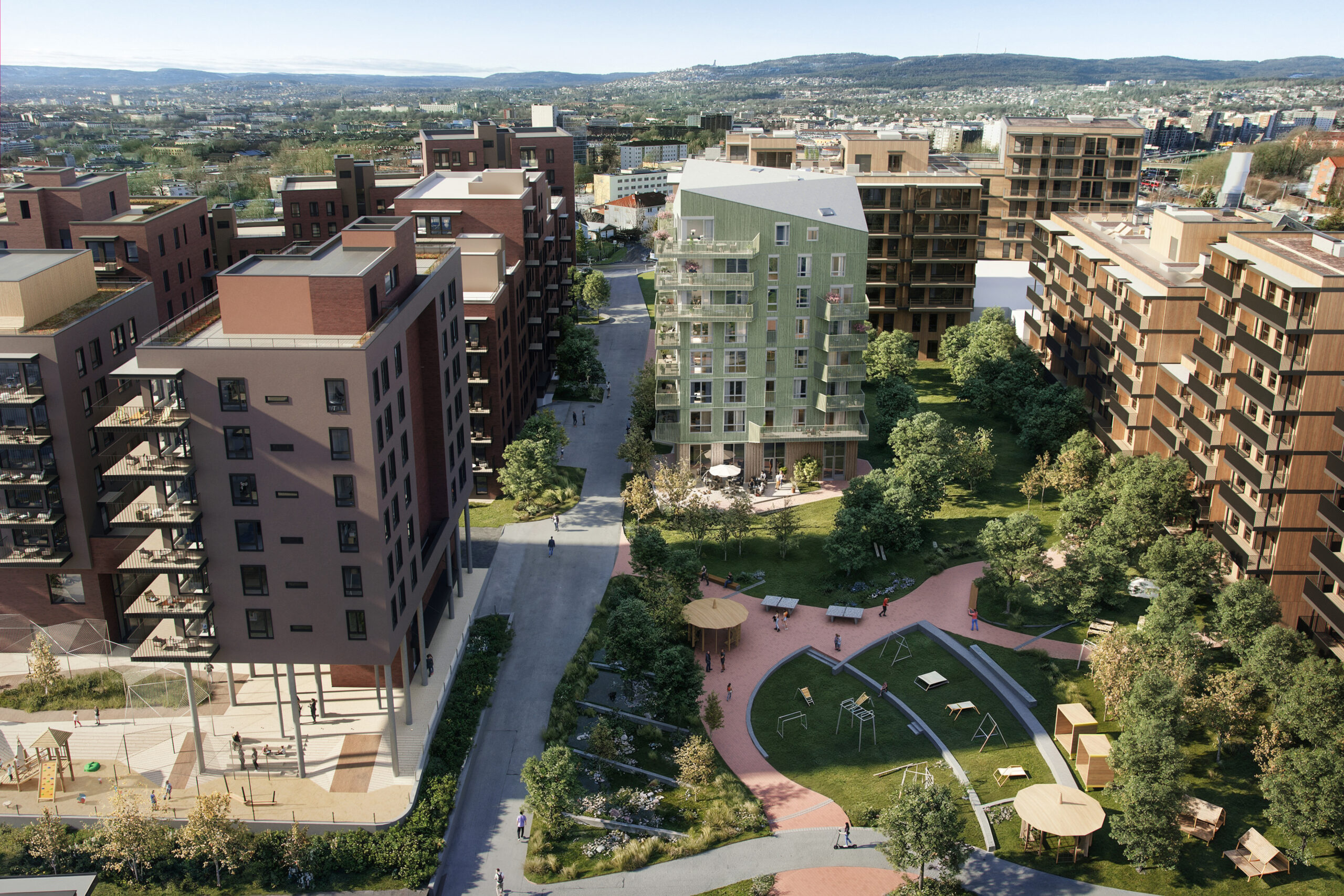 Boliger med barnehage. Første premie i begrenset konkurranse i 2009, – HRTB har utviklet prosjektet fra reguleringsfasen – kvartalet er nå i gang med trinnvis utbygging og lagt ut for salg.