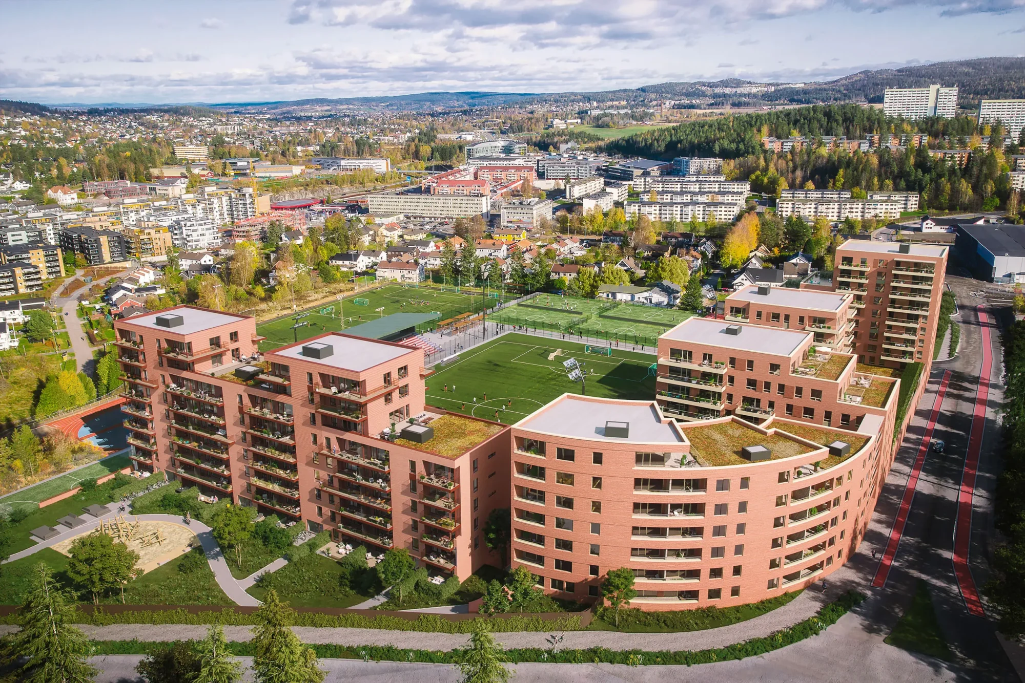 Boligbebyggelsen har 289 leiligheter i 5 blokker rundt hovedfotballbanen på Rolvsrud idrettspark i Lørenskog . Fire av blokkene er plassert på en sokkeletasje, som delvis ligger under terreng og inneholder næringsarealer, parkering og boder.