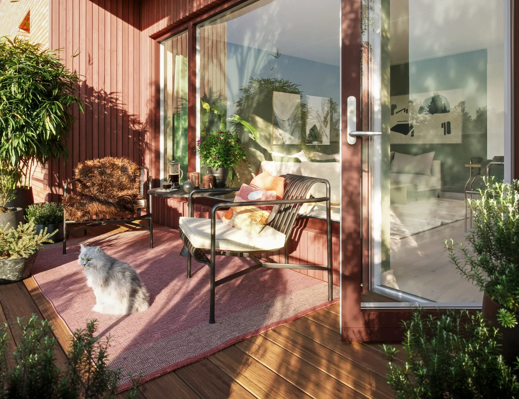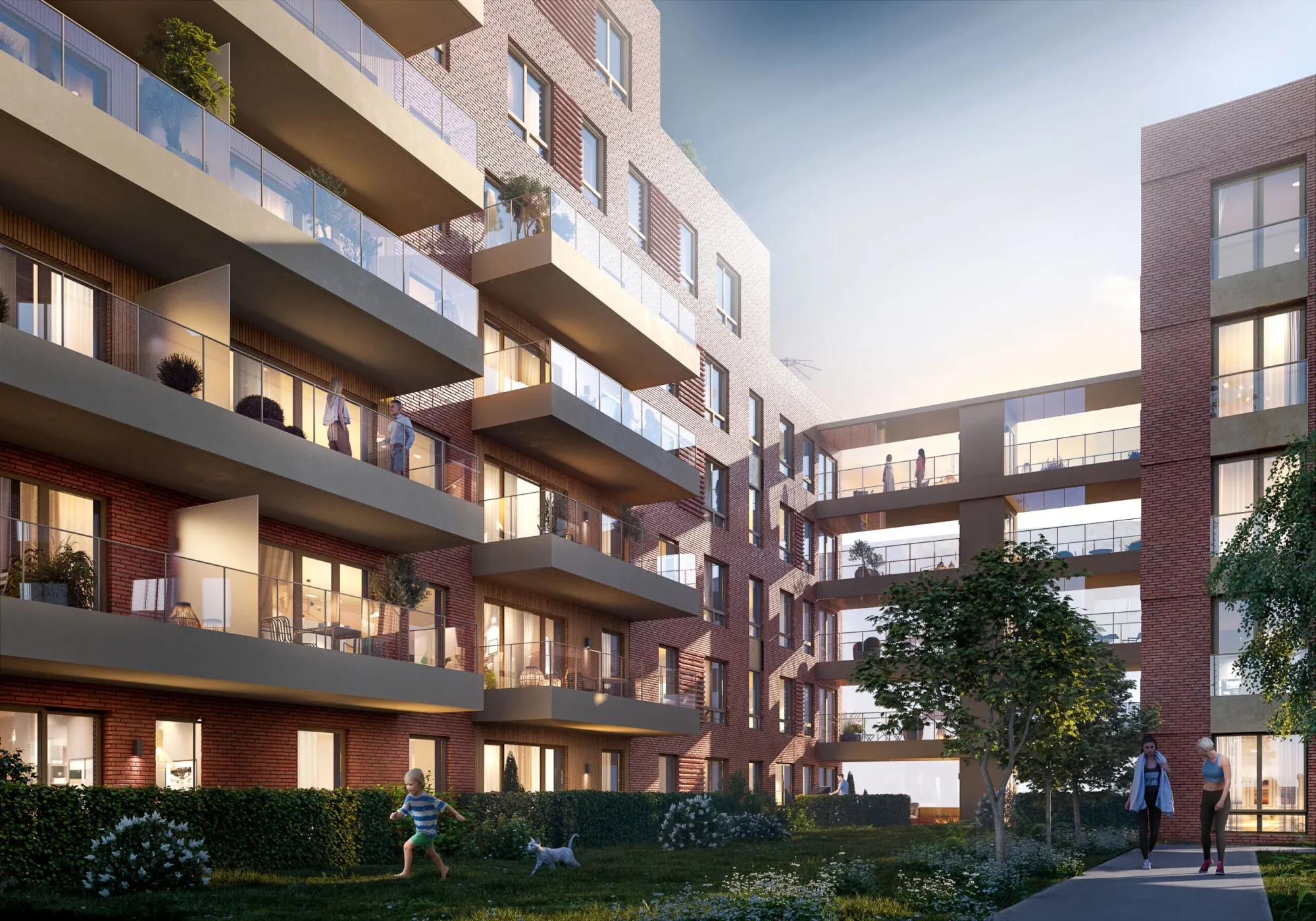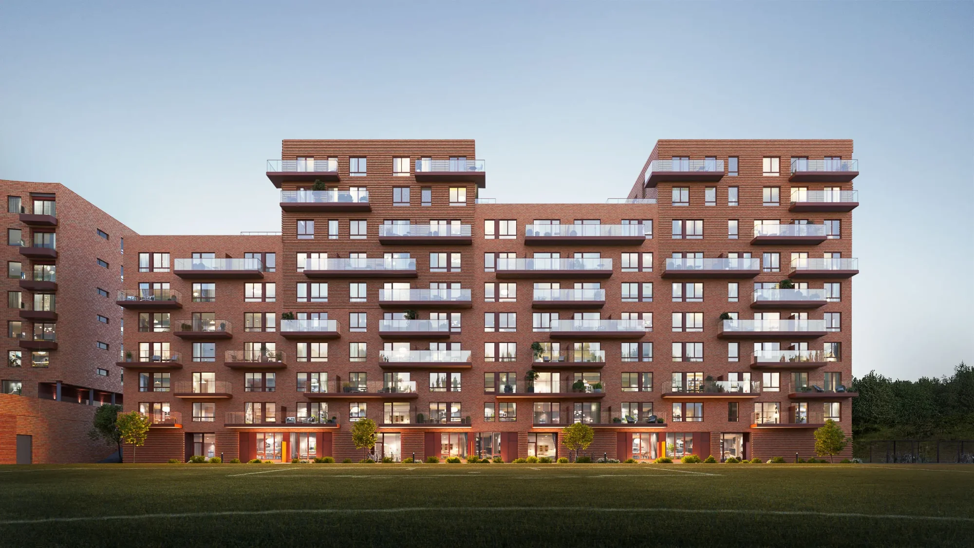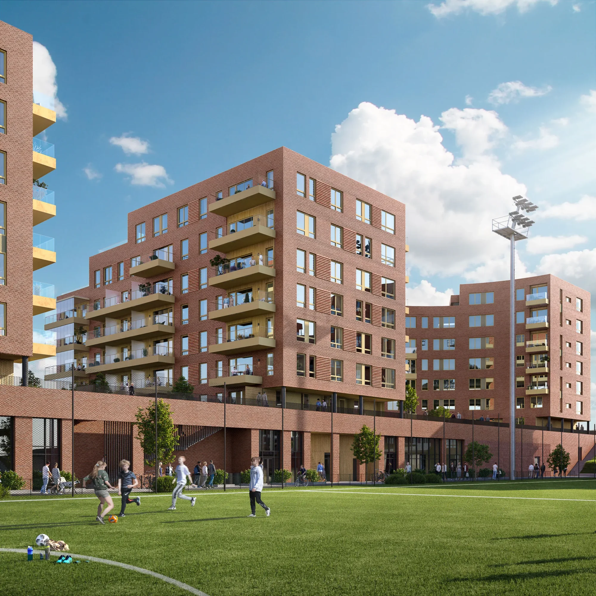 Det er stor variasjon med hensyn til leilighetstyper, beliggenhet og størrelser, fra små 1-roms til store 4-roms med takterrasser. Orienteringen av bebyggelsen rundt den åpne idrettsarenaen gir gode lys- og utsiktsforhold til alle fasader.