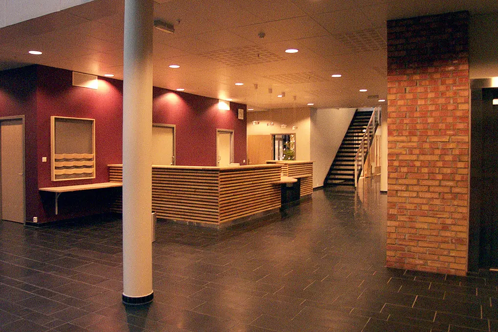 Vestibylen i sykehjemmet har direkte kontakt med inngangspartiet til omsorgsboligene. Dette gjør det enkelt for beboerne å benytte seg av aktivitetstilbudene i aktivitetssenteret.